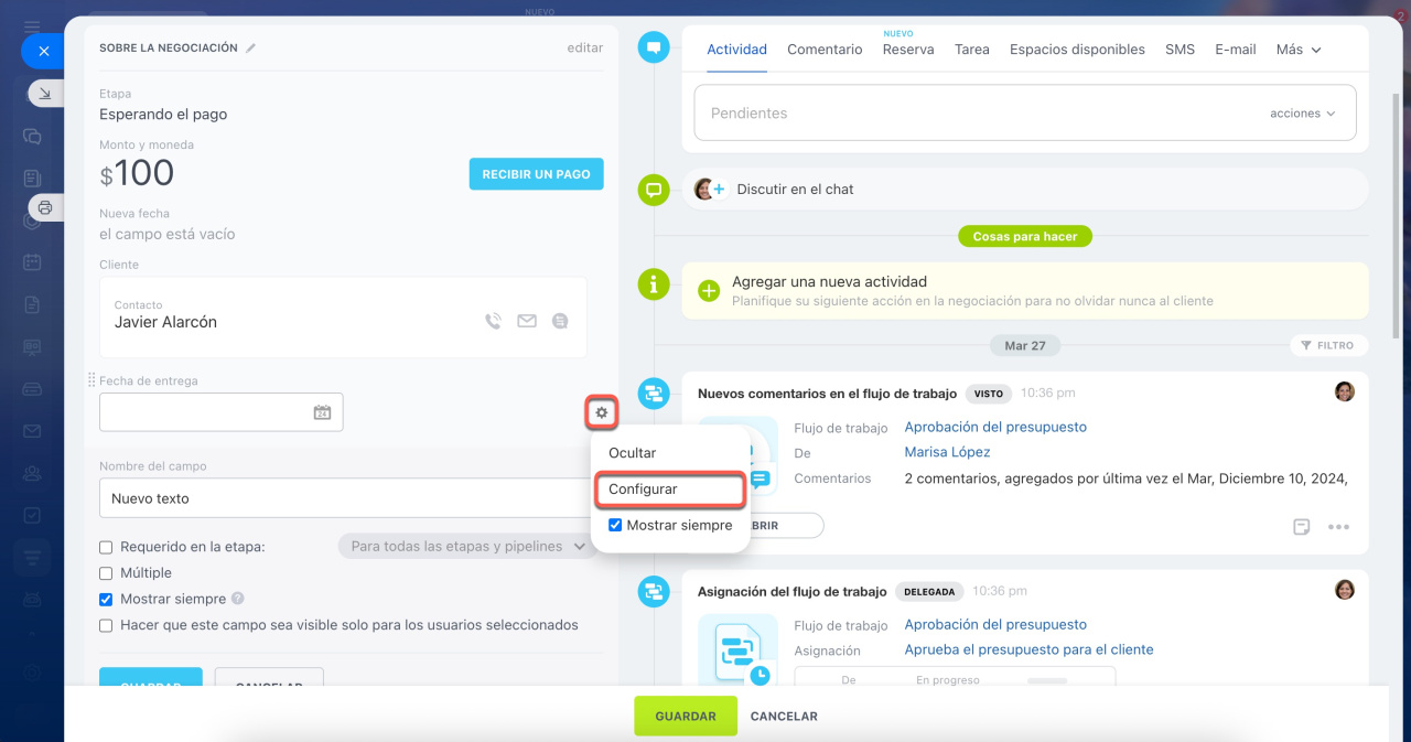 Personalizar los campos según tu negocio. Usa los campos predeterminados del sistema, como nombre, teléfono, tipo de negociación, entre otros. Si necesitas más información, crea campos personalizados, como dirección de entrega, número y fecha del pedido, etc. Esto facilita la entrada de datos y adapta el CRM a los procesos específicos de tu empresa.