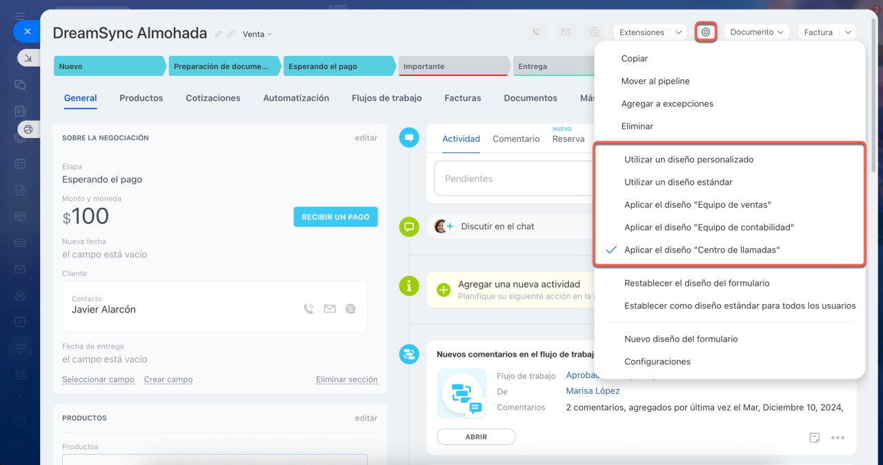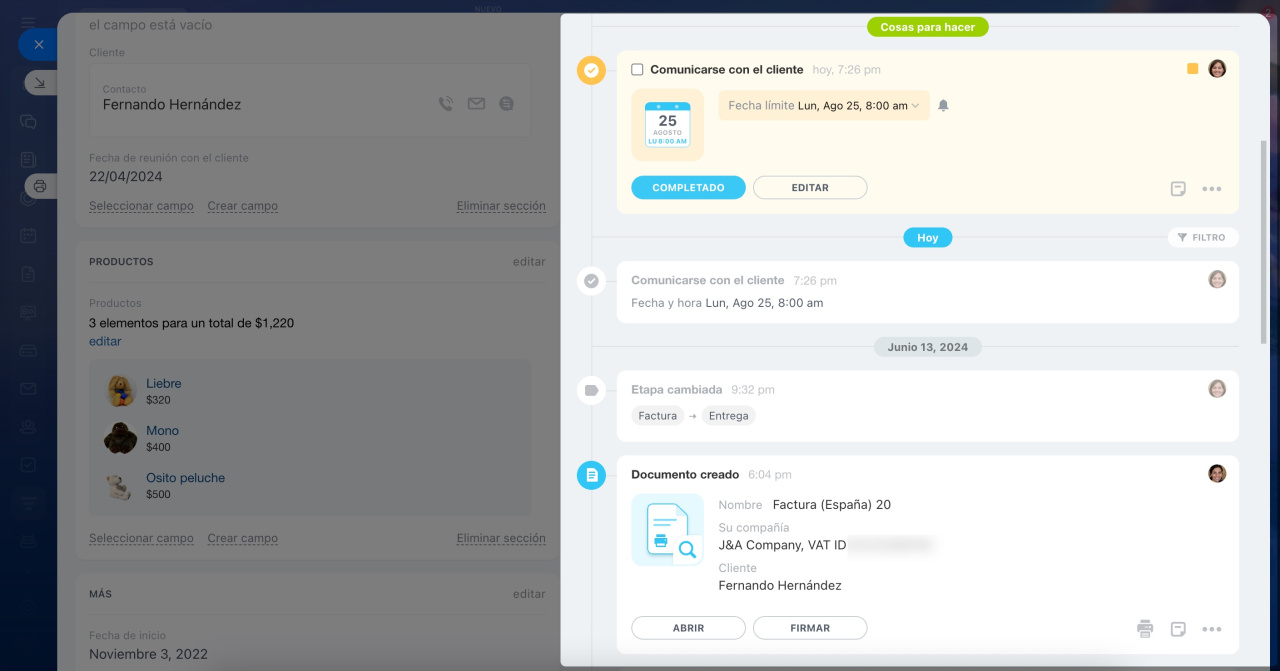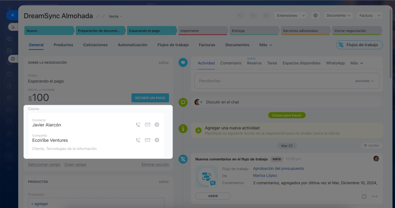 La nueva ficha de CRM reúne todo el historial de interacción con el cliente: llamadas, correos electrónicos, chats y comentarios. No es necesario cambiar entre pestañas ni perder tiempo buscando información. Además, puedes crear reuniones y tareas directamente desde la ficha, así como aceptar pagos directamente en la negociación.