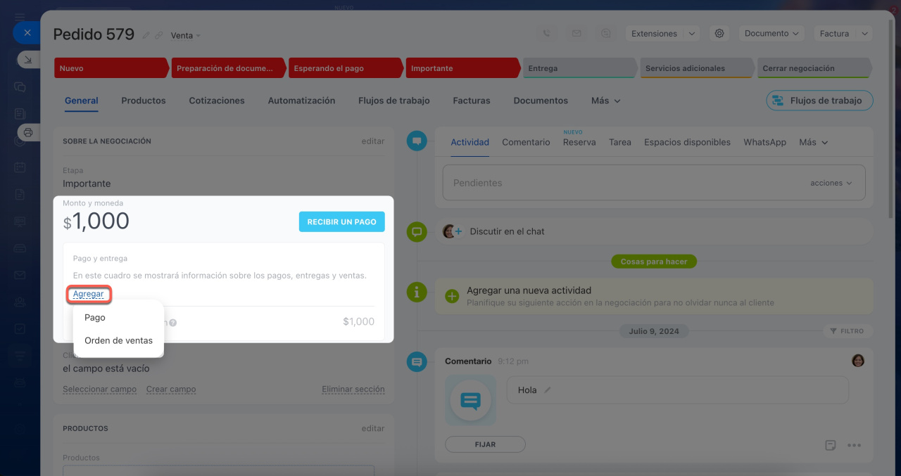 Aceptar pagos. Agrega productos desde el catálogo, y el sistema calculará automáticamente el monto total de la negociación. También puedes ajustar el monto manualmente si es necesario. Conecta diferentes servicios de pago o registra los pagos al momento de la recepción. Esto acelera el proceso de ventas y simplifica el registro de los pagos.