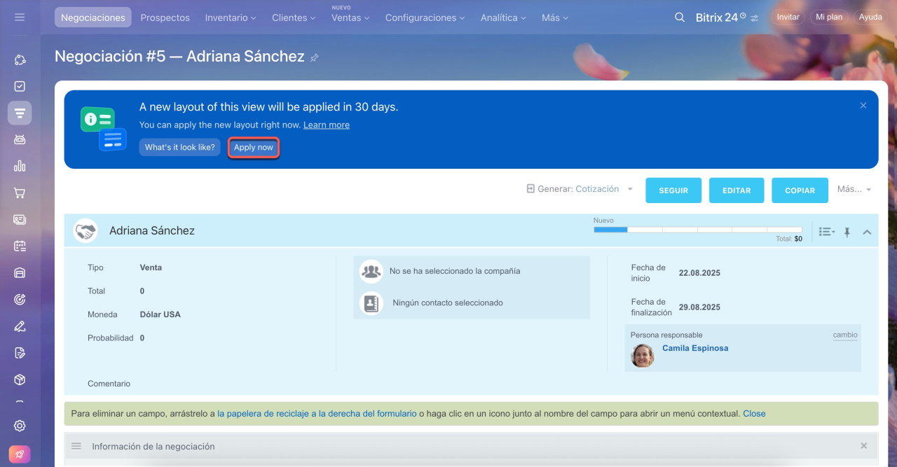 Los administradores de Bitrix24 y los empleados con permisos para modificar la configuración del CRM pueden activar la nueva ficha de inmediato. Para hacerlo, abre la ficha de cualquier elemento del CRM, como una negociación, y haz clic en Aplicar ahora (Apply now).