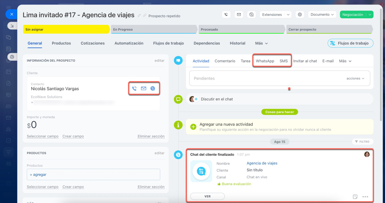 Comunicarse con el cliente. Realiza llamadas o envía mensajes directamente desde la ficha de CRM. Toda la correspondencia se guarda automáticamente en el historial del cliente. Por lo tanto, no necesitas cambiar entre aplicaciones, ahorras tiempo y mantienes el contexto completo de la conversación.