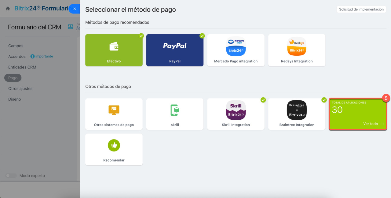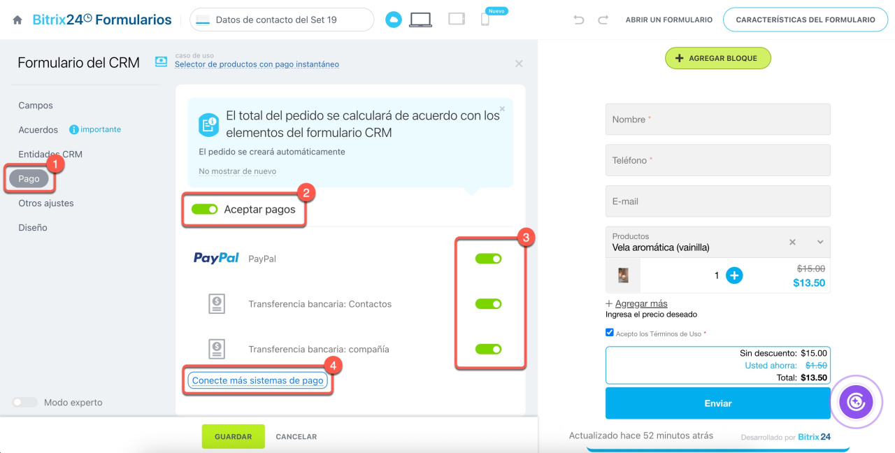 - Si conectas un nuevo sistema de pago en el formulario CRM o en el Centro de ventas, este se habilitará automáticamente en todos los formularios donde esté permitido el pago.