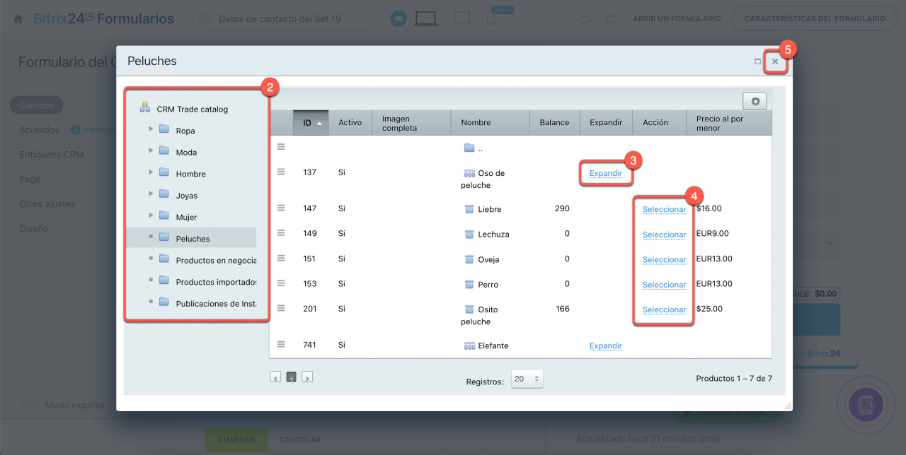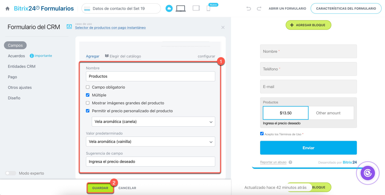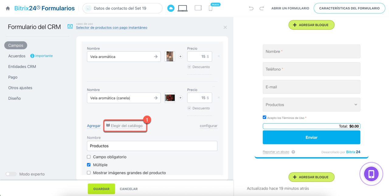 Para que los clientes puedan realizar pedidos, especifica el catálogo de productos y configura los campos para la selección de productos en cada formulario del CRM.