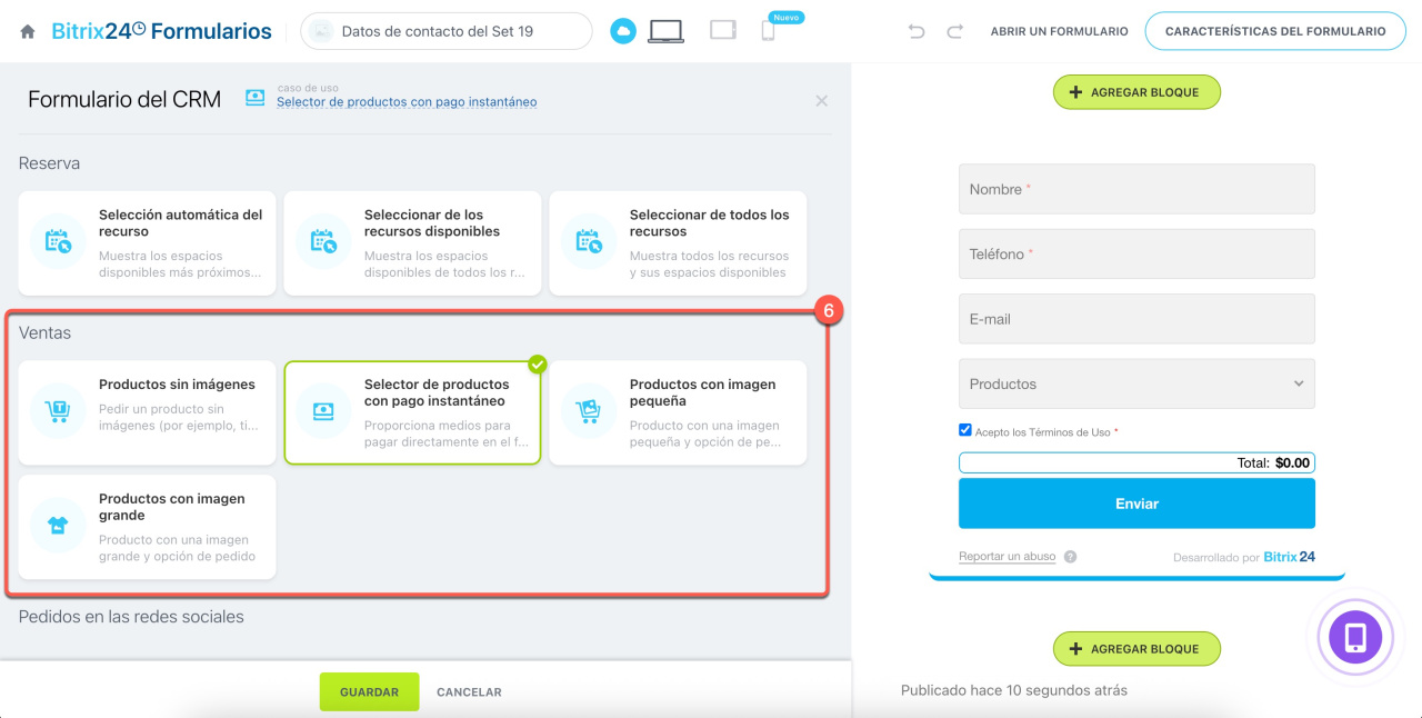 - Crea un formulario CRM y selecciona uno de los escenarios de ventas: sin imágenes, con imagen grande o pequeña, o con pago habilitado.