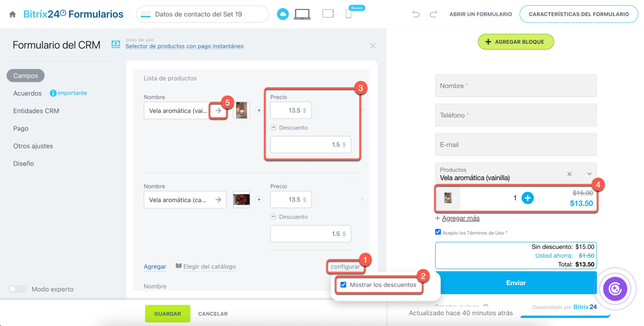 3–4. Completa los campos Precio y Descuento. El cliente verá ambos precios en el formulario: el original y el con descuento.