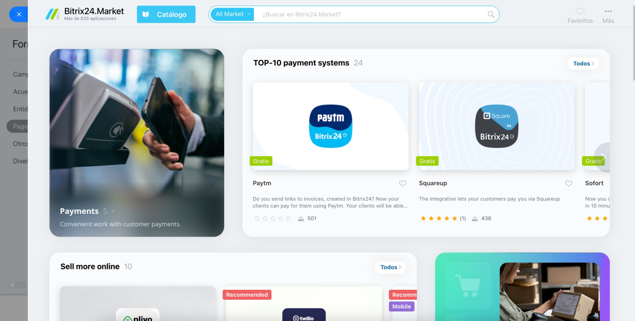 4-6. Si no encuentras una solución adecuada en la lista, haz clic en Conectar más sistemas de pago > Ver todo y selecciona una aplicación del catálogo de Bitrix24 Market.