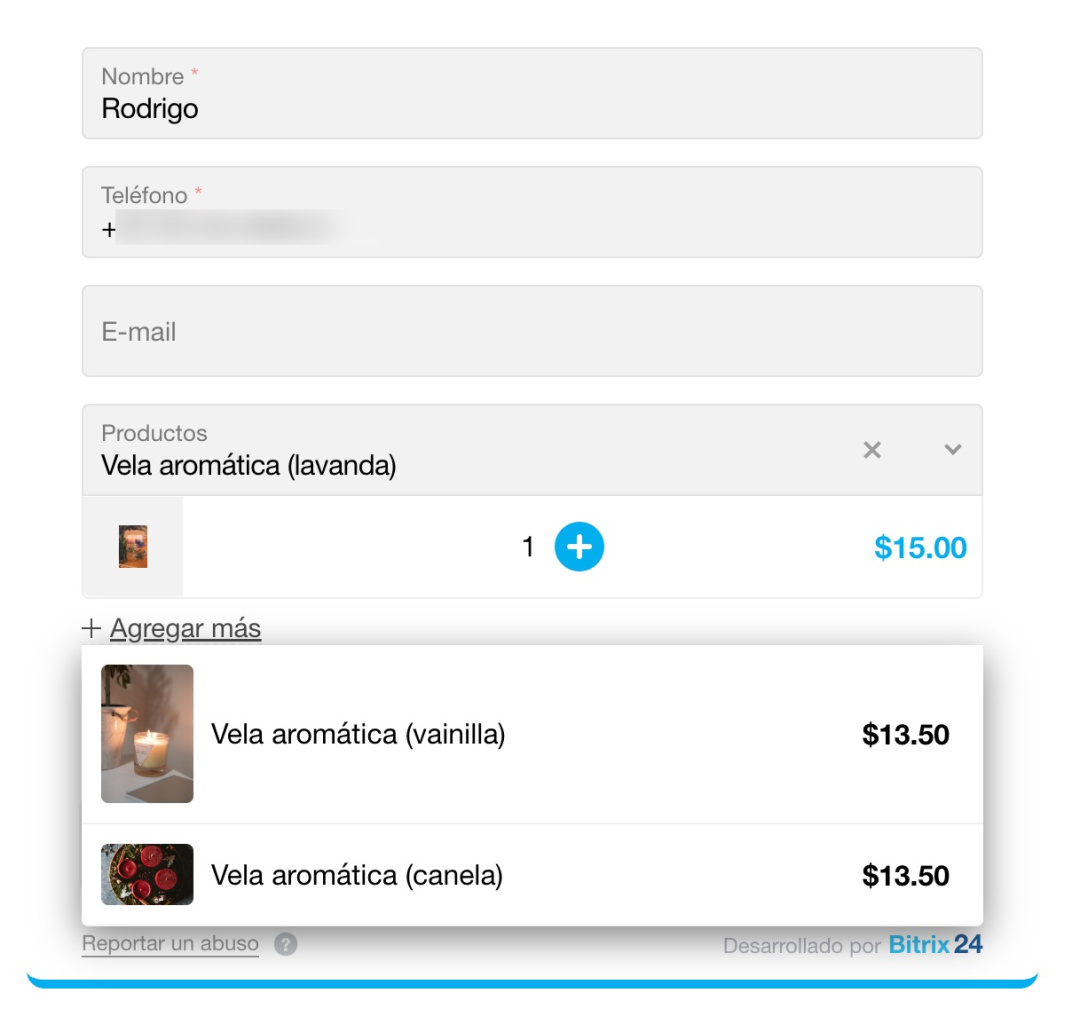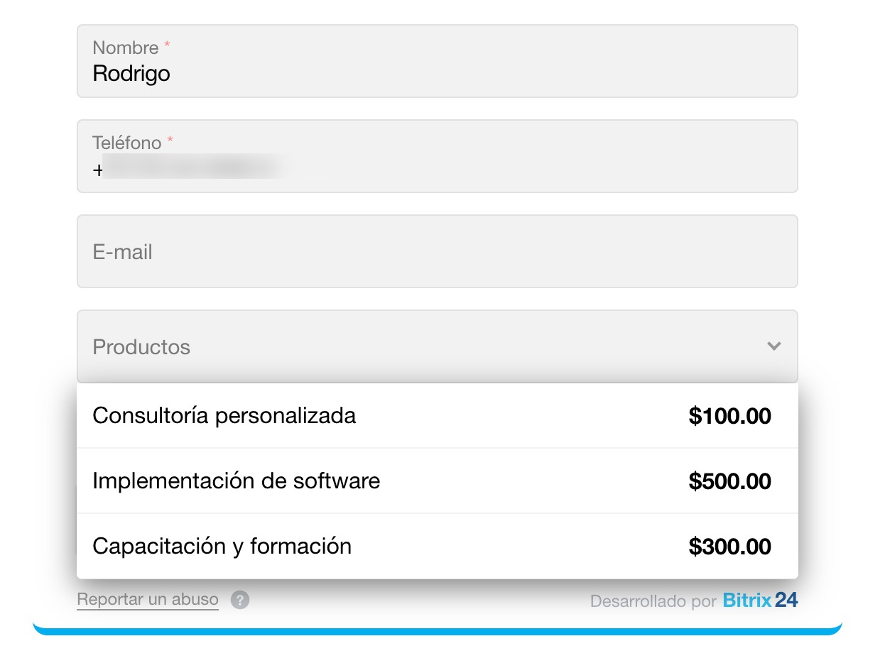 Por defecto, el formulario muestra las tres primeras posiciones del catálogo del CRM. Si el catálogo está vacío, puedes crear nuevos productos directamente en el formulario del CRM.