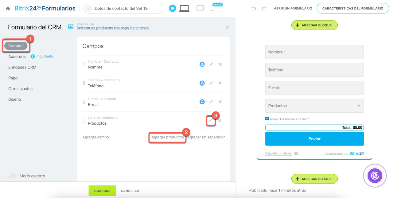 - Ve a la pestaña Campos y edita el campo Productos: agrega productos, modifica sus nombres, imágenes y precios, y configura la selección de productos.