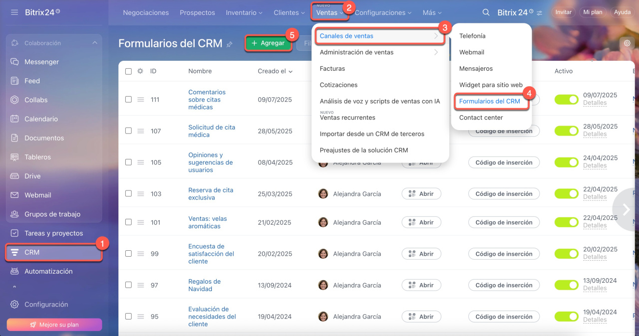 1–4. Ve a la sección de CRM > Ventas > Canales de ventas > Formularios del CRM.