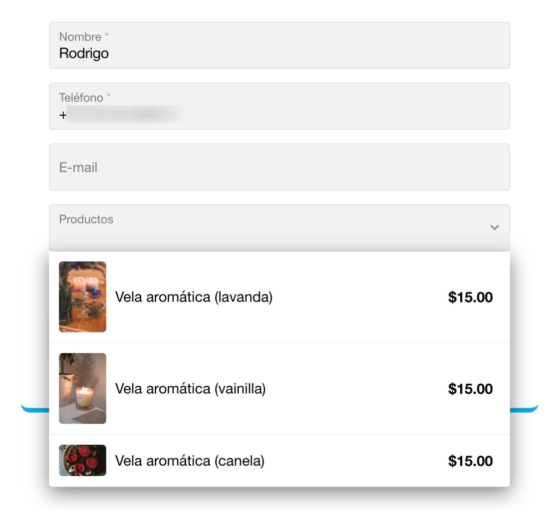 - Nombre: si el formulario tiene varios campos de productos, utiliza nombres claros, como Selecciona una joya, Selecciona un empaque.