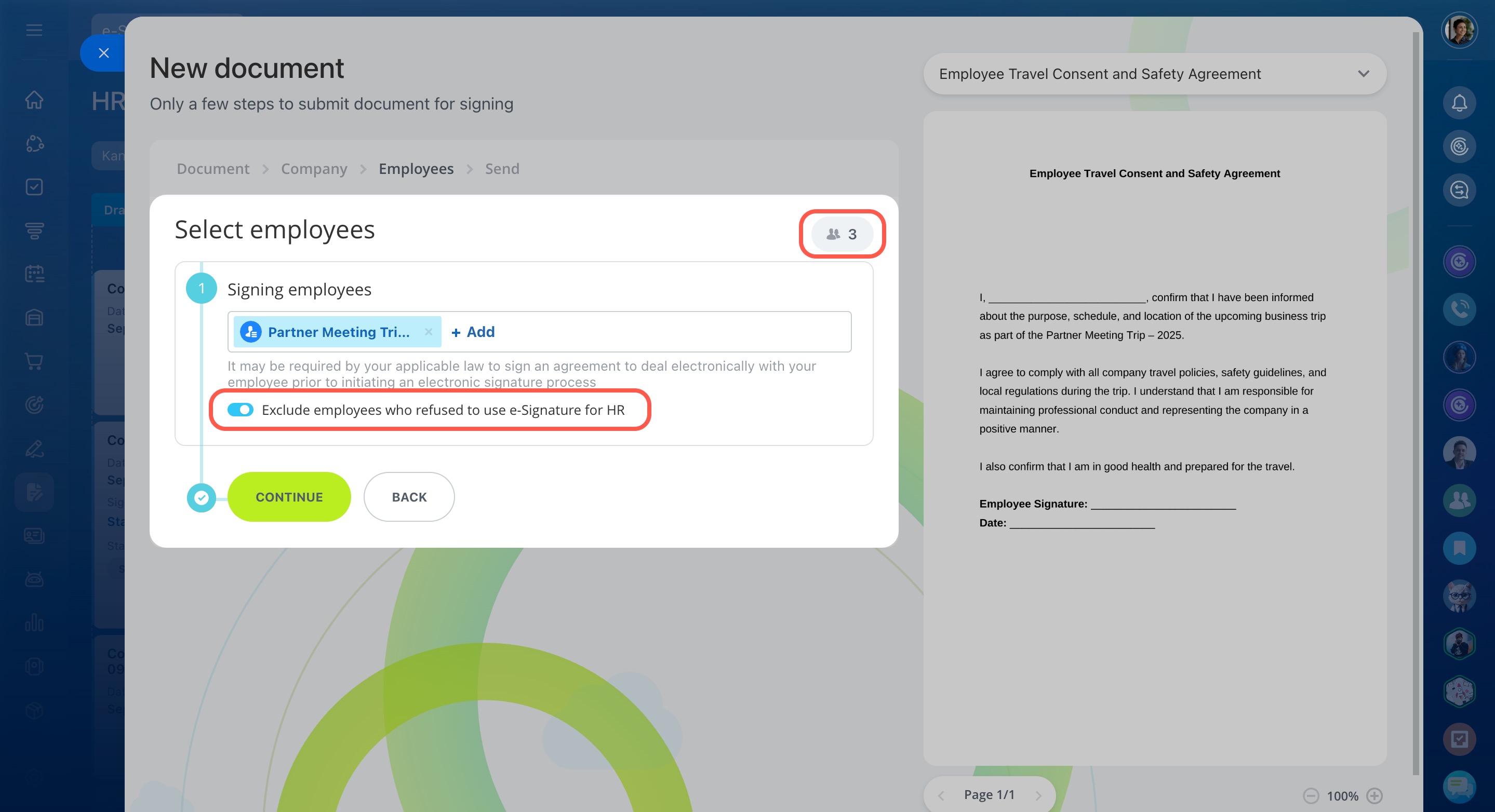 - Al enviar un documento para firmar, la opción Exclude employees who refused to use e-Signature for HR está activada por defecto, por lo que el documento se envía solo a los empleados que aceptaron firmar electrónicamente.