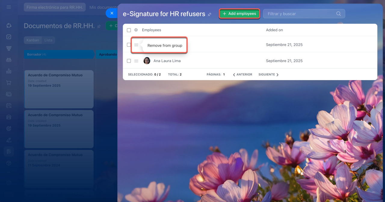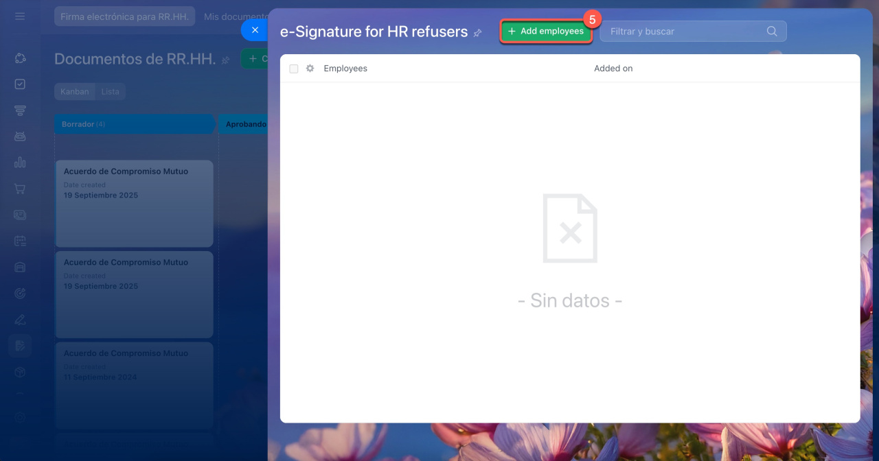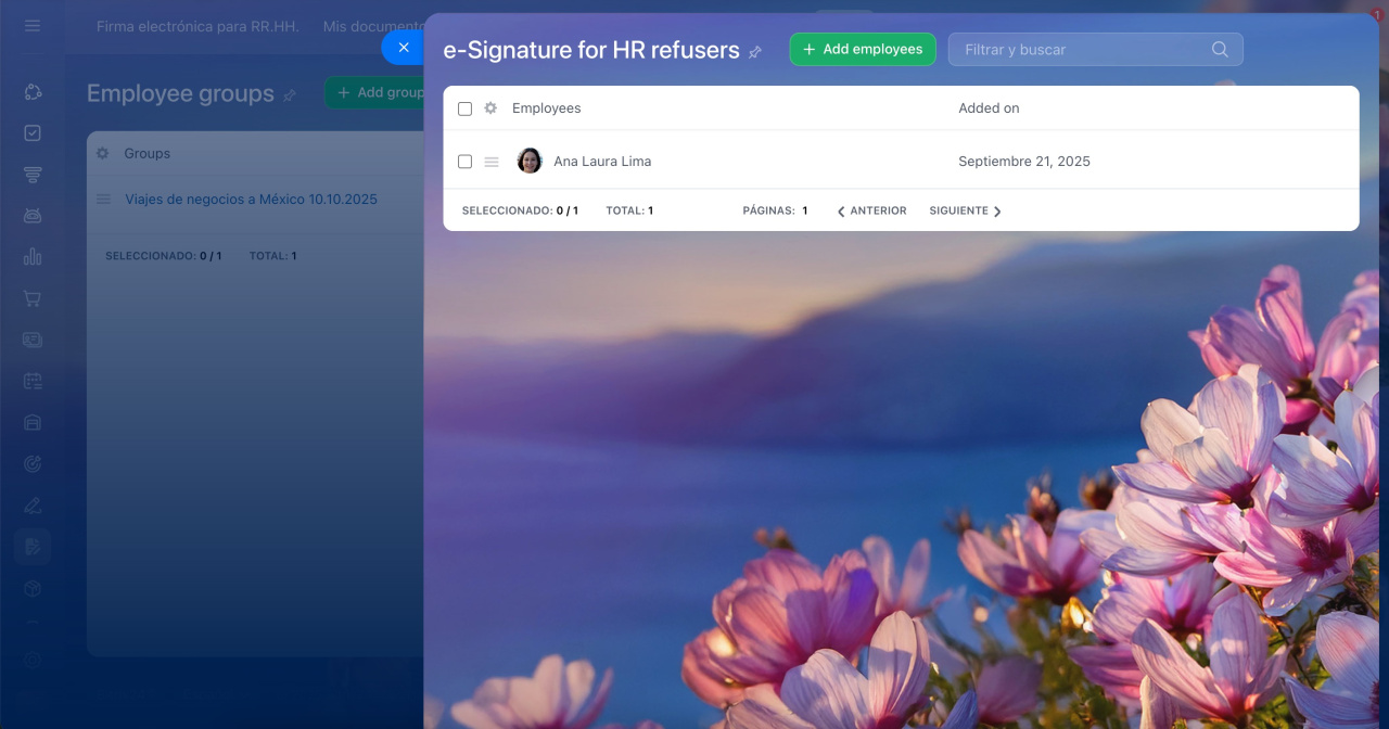 - Para crear la lista, ve a Firma electrónica para RR. HH. > Más > Empleados (Employees) > Refused to use e-Signature for HR.