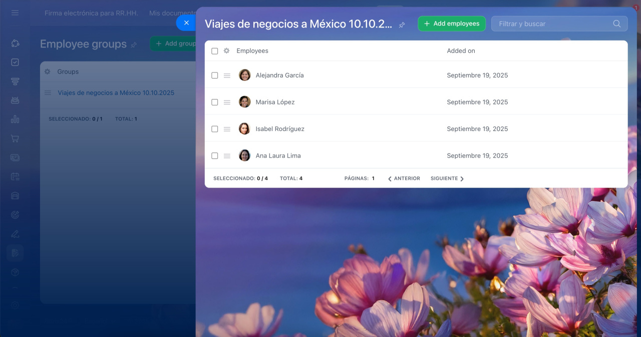 Por ejemplo, creaste un grupo de cuatro empleados y les envías una orden de viaje. Uno de ellos rechazó Firma electrónica para RR. HH. y solo firma documentos en papel.