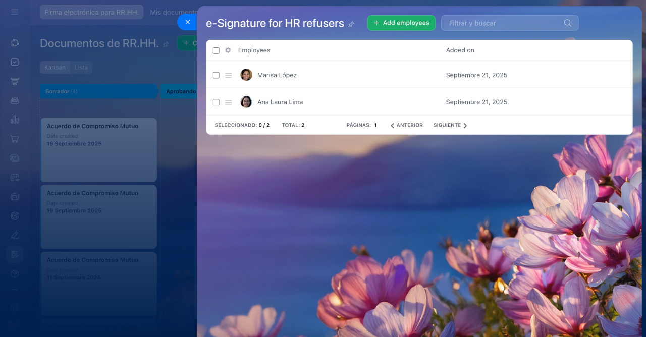 - Crea una lista de empleados que se negaron a usar Firma electrónica para RR. HH. en Bitrix24 y prefieren firmar documentos en papel. Los empleados de esta lista quedan automáticamente excluidos del proceso de firma de documentos.