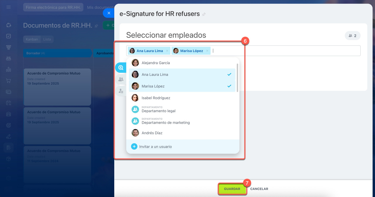6–7. Selecciona empleados o departamentos de la lista. Guarda los cambios.