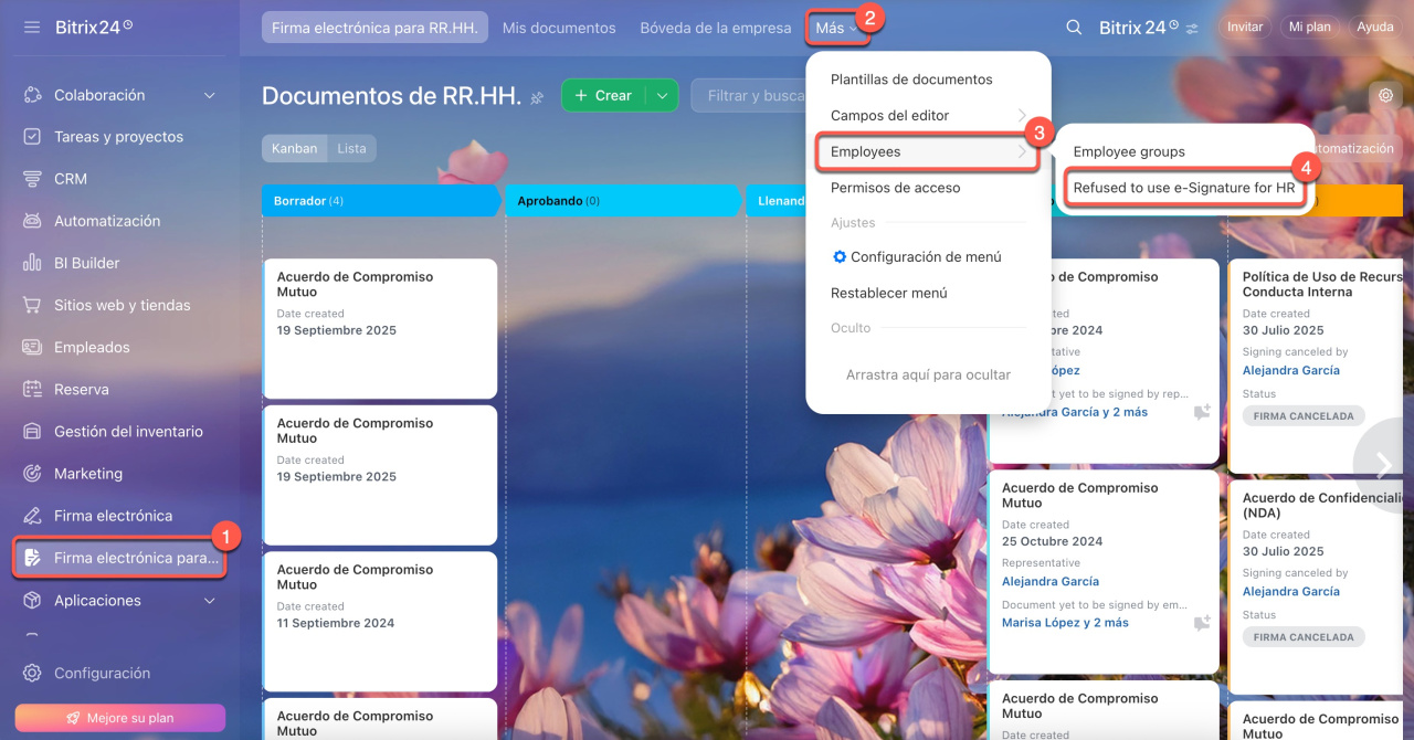 1-4. Ve a la sección de Firma electrónica para RR. HH. > Más > Empleados (Employees) > Refused to use e-Signature for HR.