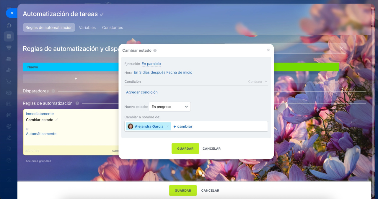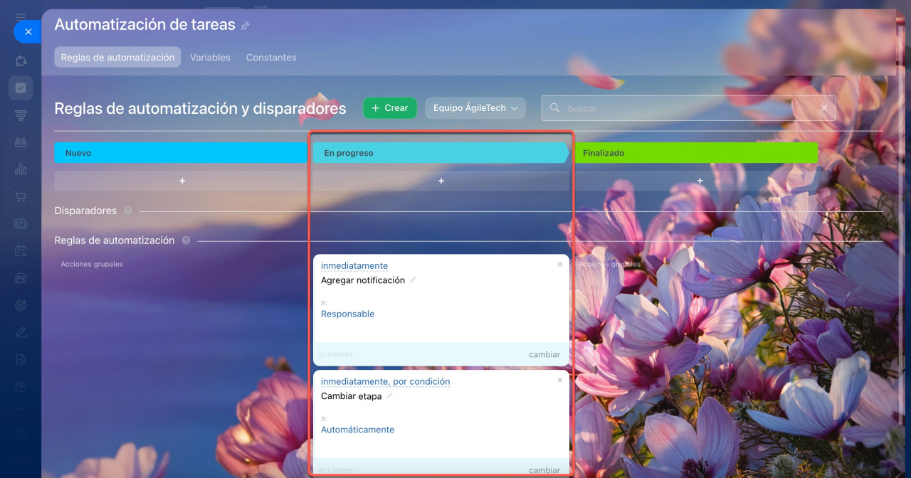 - Las reglas de automatización realizan acciones cuando una tarea pasa a una etapa específica: envían notificaciones, crean tareas, agregan participantes, entre otros.