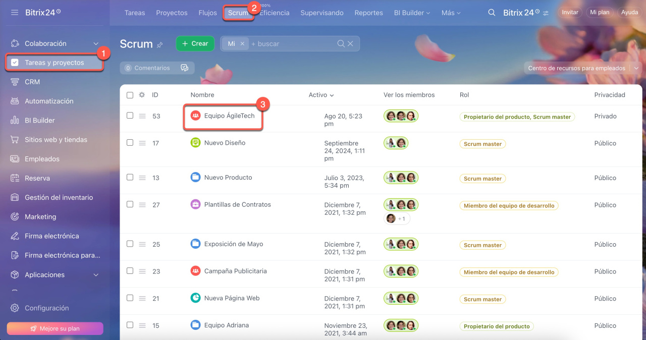 1–3. Ve a la sección de Tareas y proyectos > Scrum y abre el proyecto deseado.