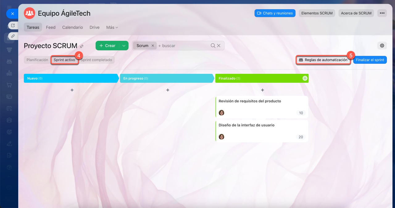 - Para configurar reglas de automatización, ve a la sección de Tareas y proyectos > Scrum y abre el proyecto deseado. Ve a la pestaña Sprint activo y haz clic en Reglas de automatización.