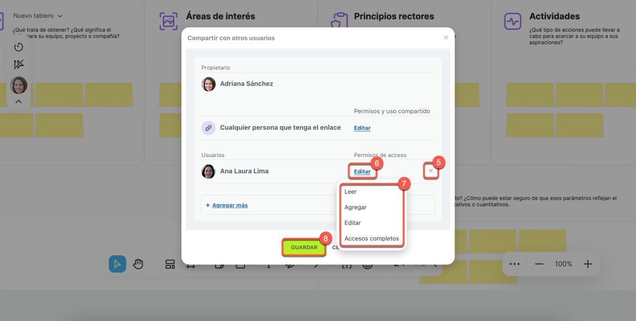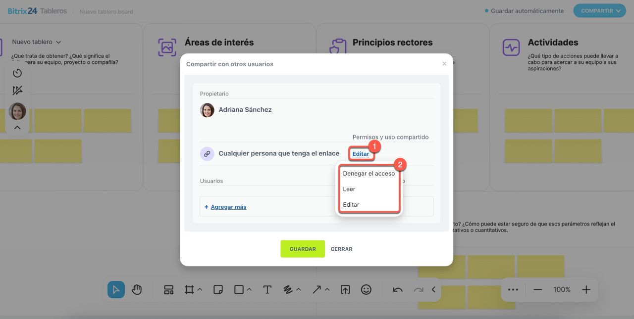 - Leer: permite ver el documento y usar herramientas que no afectan su contenido. Por ejemplo, en un tablero, activar o desactivar los cursores de otros participantes.