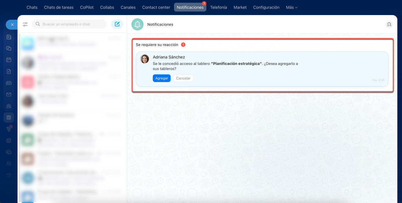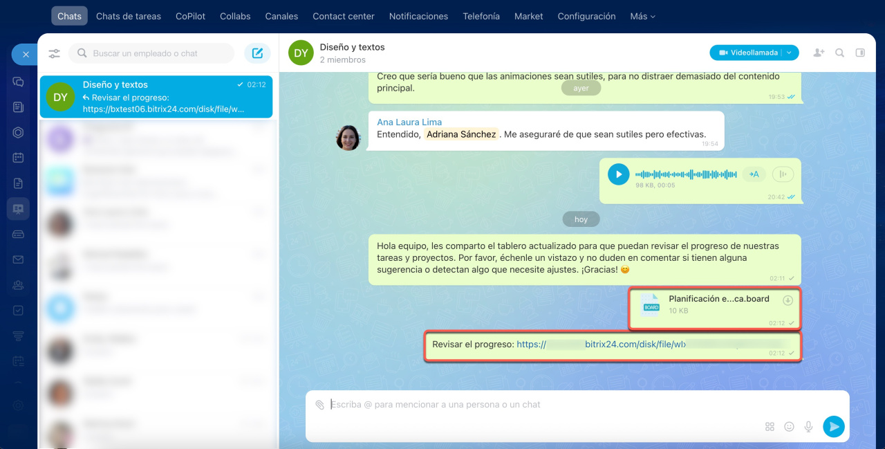 Por ejemplo, si añades un tablero privado a un chat grupal, todos los participantes podrán editarlo. Esto resulta práctico para colaborar rápidamente sin configurar manualmente los permisos.