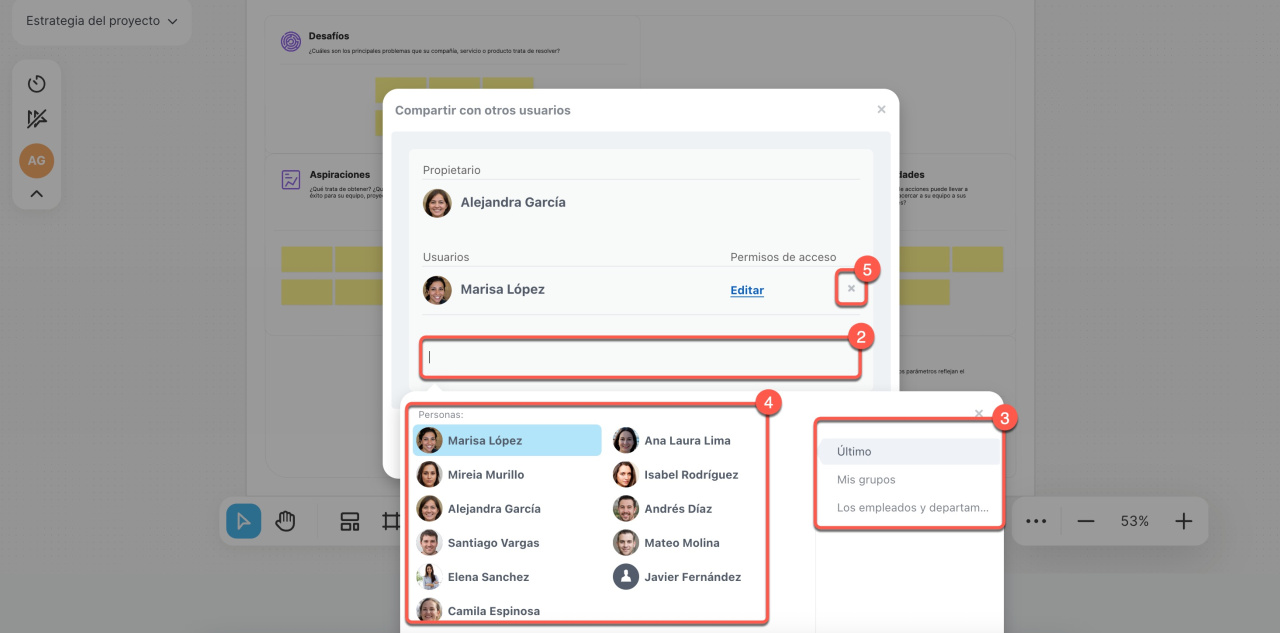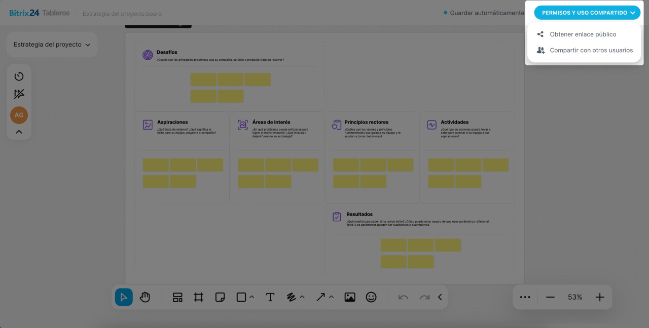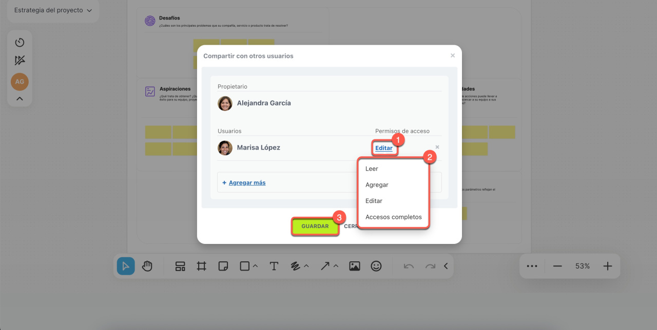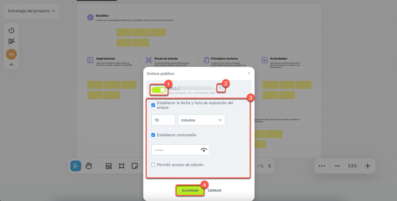 - Permitir acceso de edición: permite a los usuarios realizar cambios, como agregar elementos, mover bloques, dejar notas, etc. Al finalizar el trabajo, desactiva la edición para fijar el resultado.