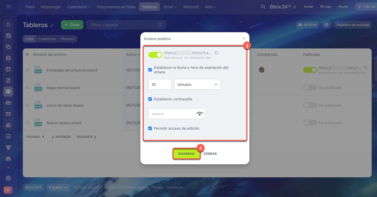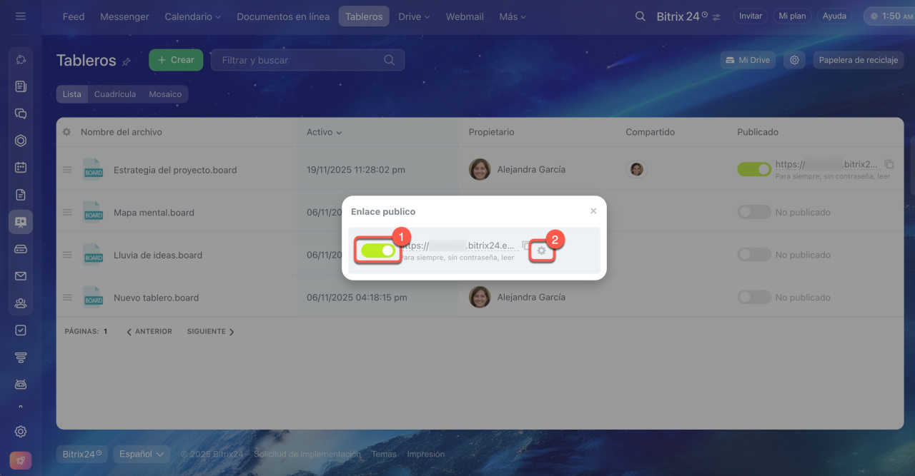 - Obtener enlace público: para usuarios externos, como clientes o contratistas.