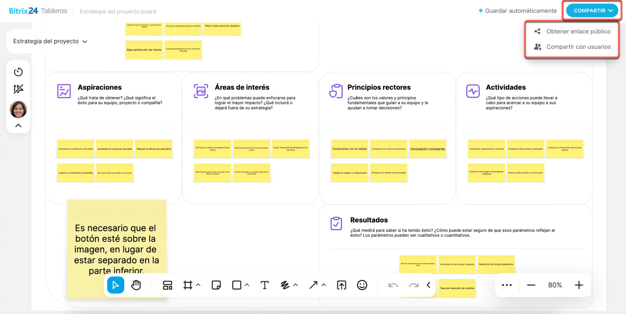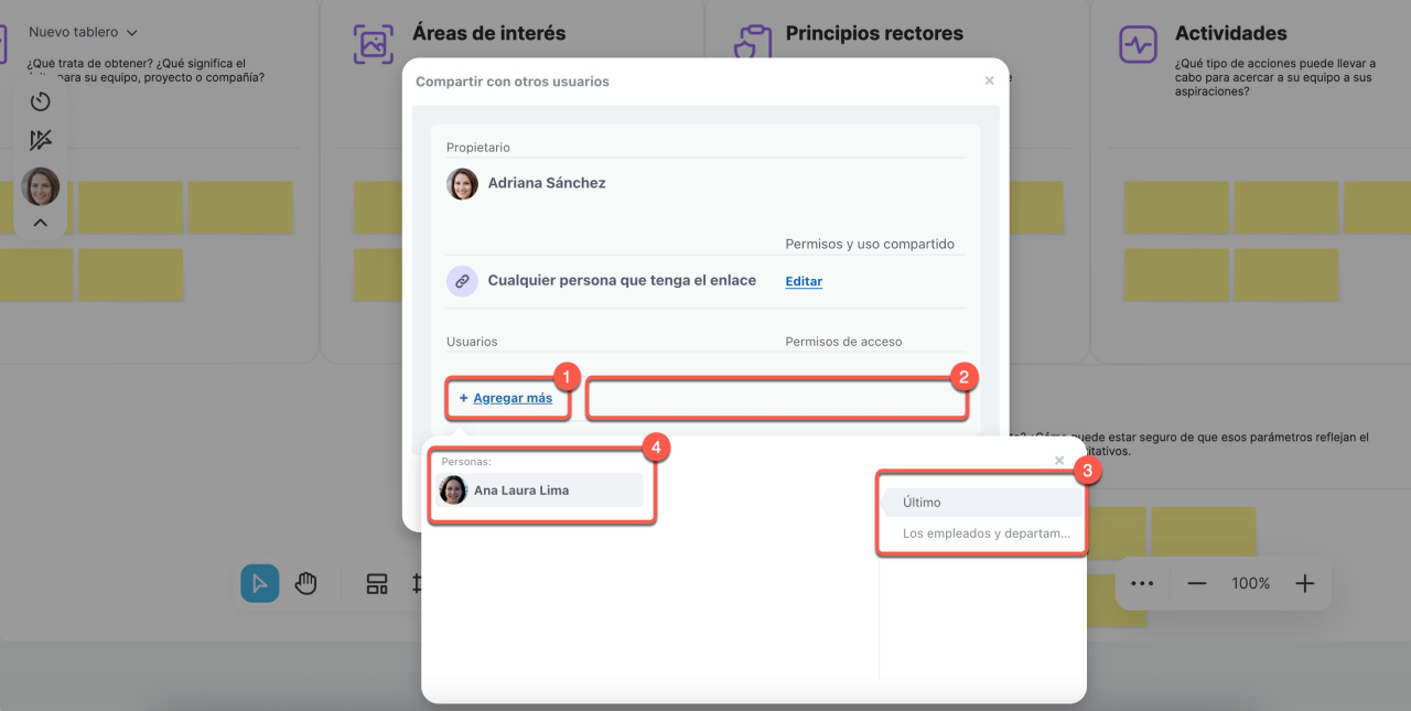 Desde el editor de documentos o tableros. Si ya estás trabajando en un documento o tablero, haz clic en Compartir y selecciona una opción: