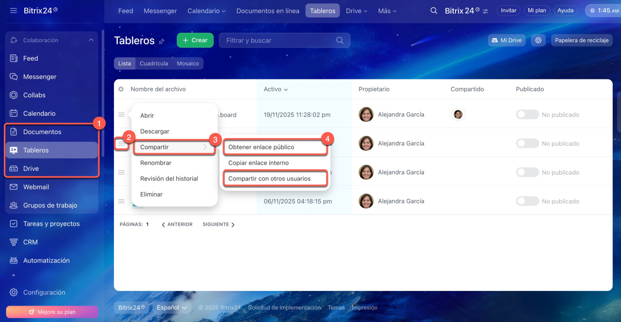 - Bitrix24 permite trabajar de forma colaborativa con documentos, tableros, hojas de cálculo y presentaciones, configurando el acceso de manera flexible.