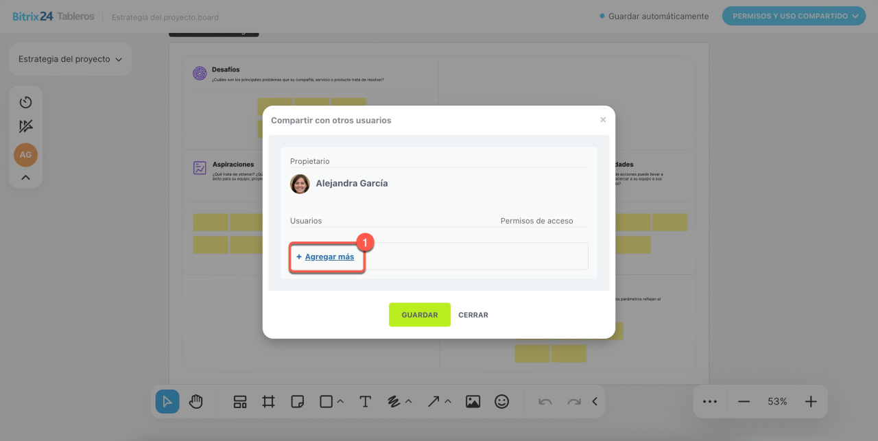 Los Tableros de Bitrix24 ayudan al equipo a trabajar en conjunto: son ideales para visualizar tareas, proyectos e ideas. Para mantener la información bajo control, configura el acceso a los tableros de manera flexible para diferentes usuarios. Por ejemplo, permitir que los empleados editen el tablero, mientras que los clientes y expertos externos solo puedan visualizarlo. Esto permite involucrar a participantes externos sin riesgo de pérdida o modificación de datos.
