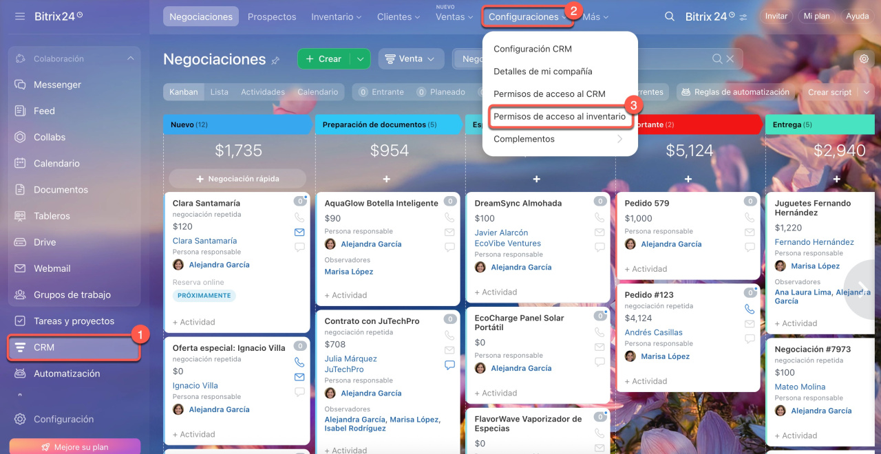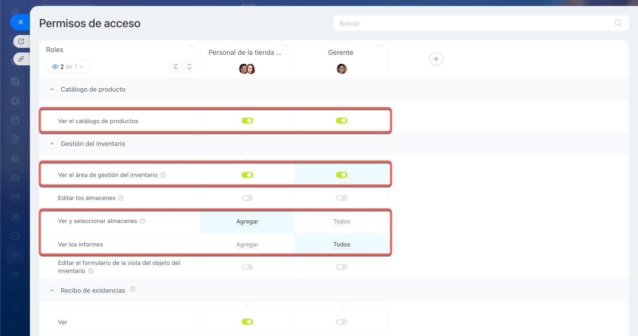 Ve a la sección de CRM > Configuraciones > Permisos de acceso al inventario. Para que un empleado pueda visualizar informes, debe tener activados los siguientes permisos:
