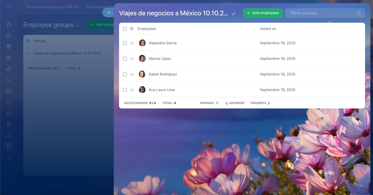 En Firma electrónica para RR. HH. de Bitrix24, puedes agrupar empleados por departamentos, proyectos o cualquier otro criterio. Esto ahorra tiempo cuando necesitas enviar el mismo documento para firma a varias personas al mismo tiempo.