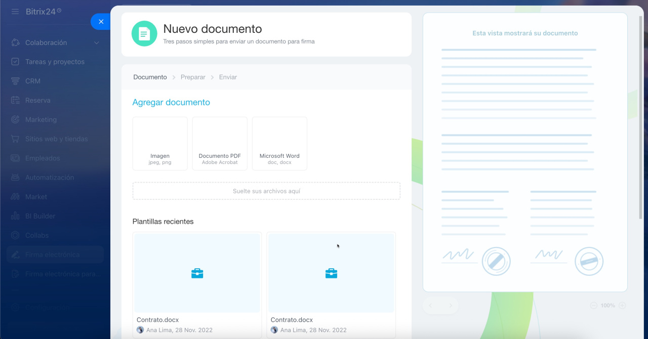 - Firma electrónica de Bitrix24 permite firmar contratos, actas y otros documentos con contrapartes sin usar servicios externos.