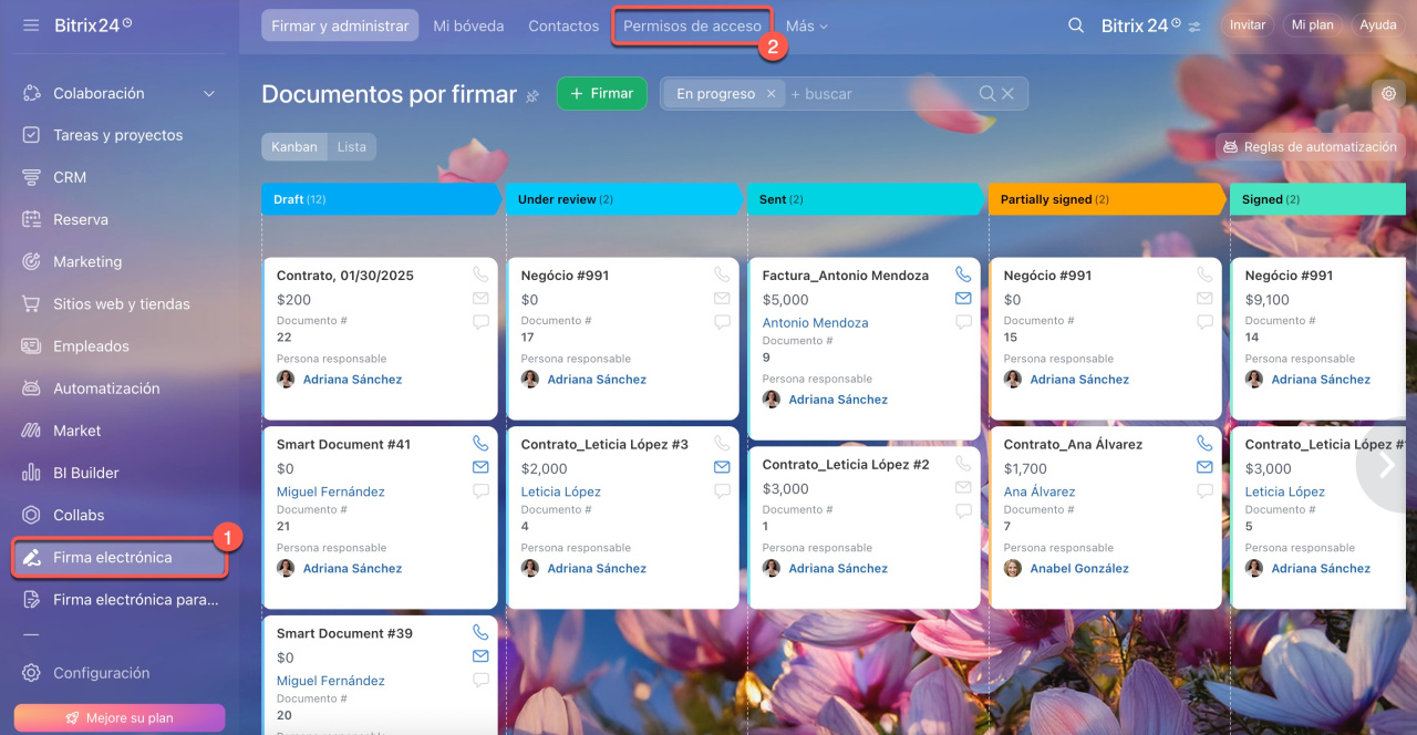 Antes de comenzar a trabajar con Firma electrónica, configura los permisos de acceso. Por ejemplo, define quién puede crear, editar y eliminar documentos.