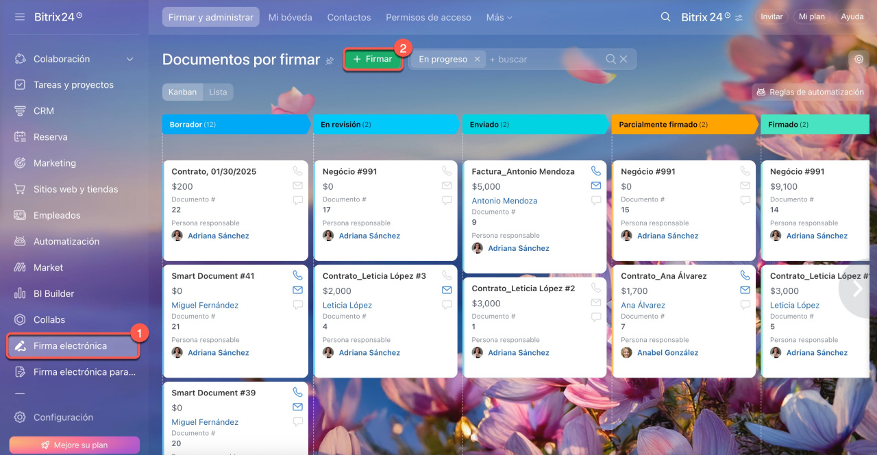 Firma electrónica de Bitrix24 permite firmar documentos con clientes, proveedores y otros socios sin necesidad de usar servicios externos. Esto ayuda a: