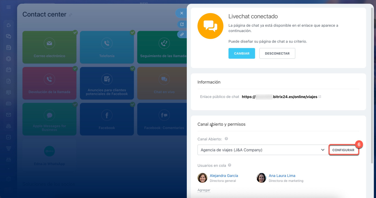 El rastreador de chats está activado por defecto para todos los canales conectados a Bitrix24. Los administradores y empleados con permiso para configurar canales abiertos pueden activarlo o desactivarlo en cualquier momento.