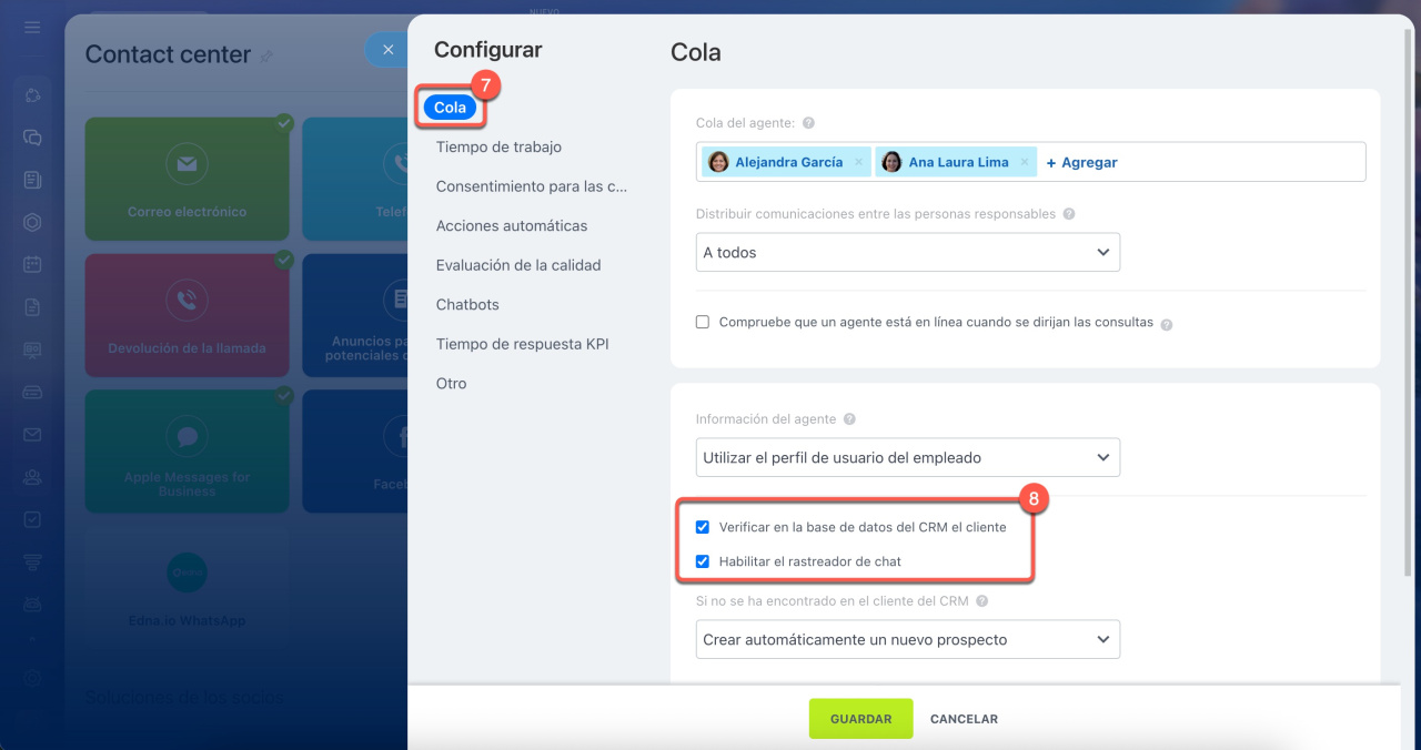 7-8. Abre la pestaña Cola y activa las opciones Verificar en la base de datos del CRM el cliente y Habilitar el rastreador de chat. Guarda los cambios.