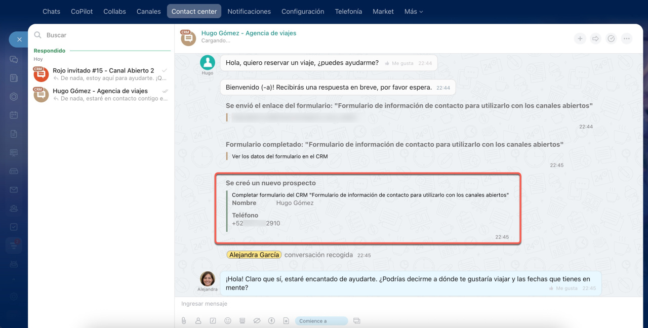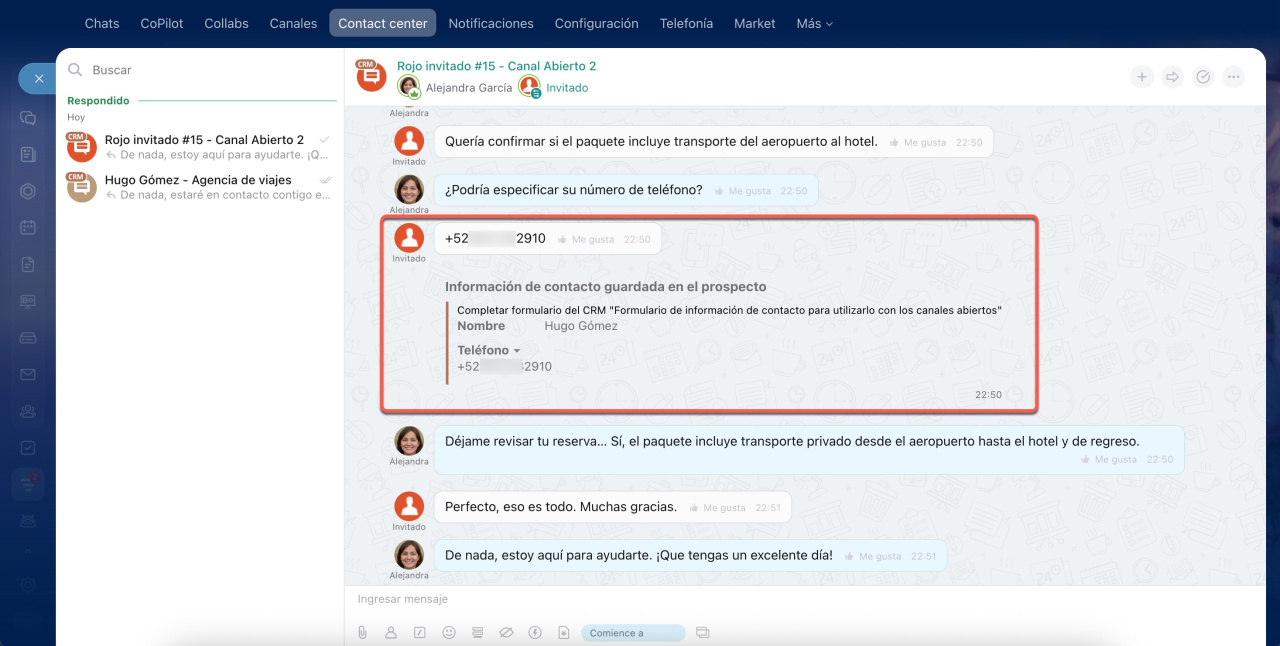 2. Durante la conversación, el cliente comparte su número de teléfono, que se agrega al prospecto o a la negociación.