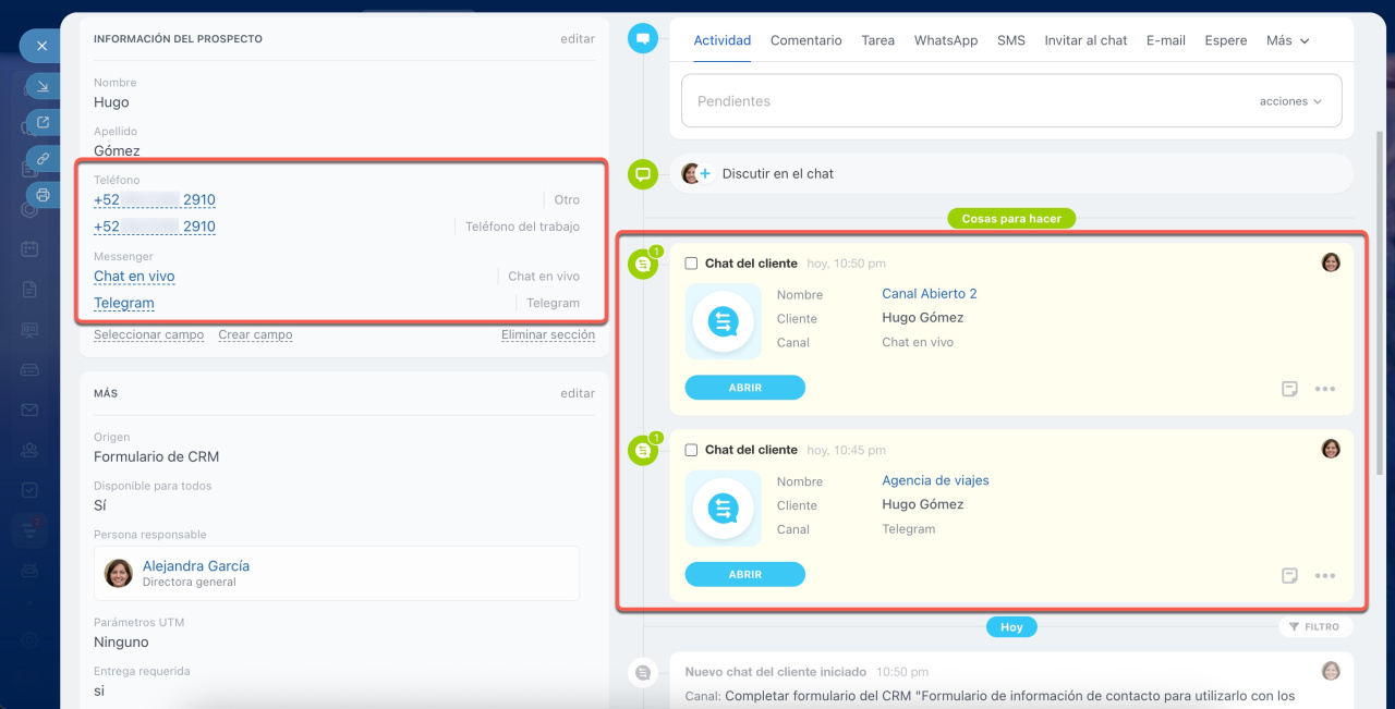 • Como resultado, el CRM contendrá un único registro con el nombre del cliente, sus datos de contacto y todo el historial de conversaciones de diferentes canales.