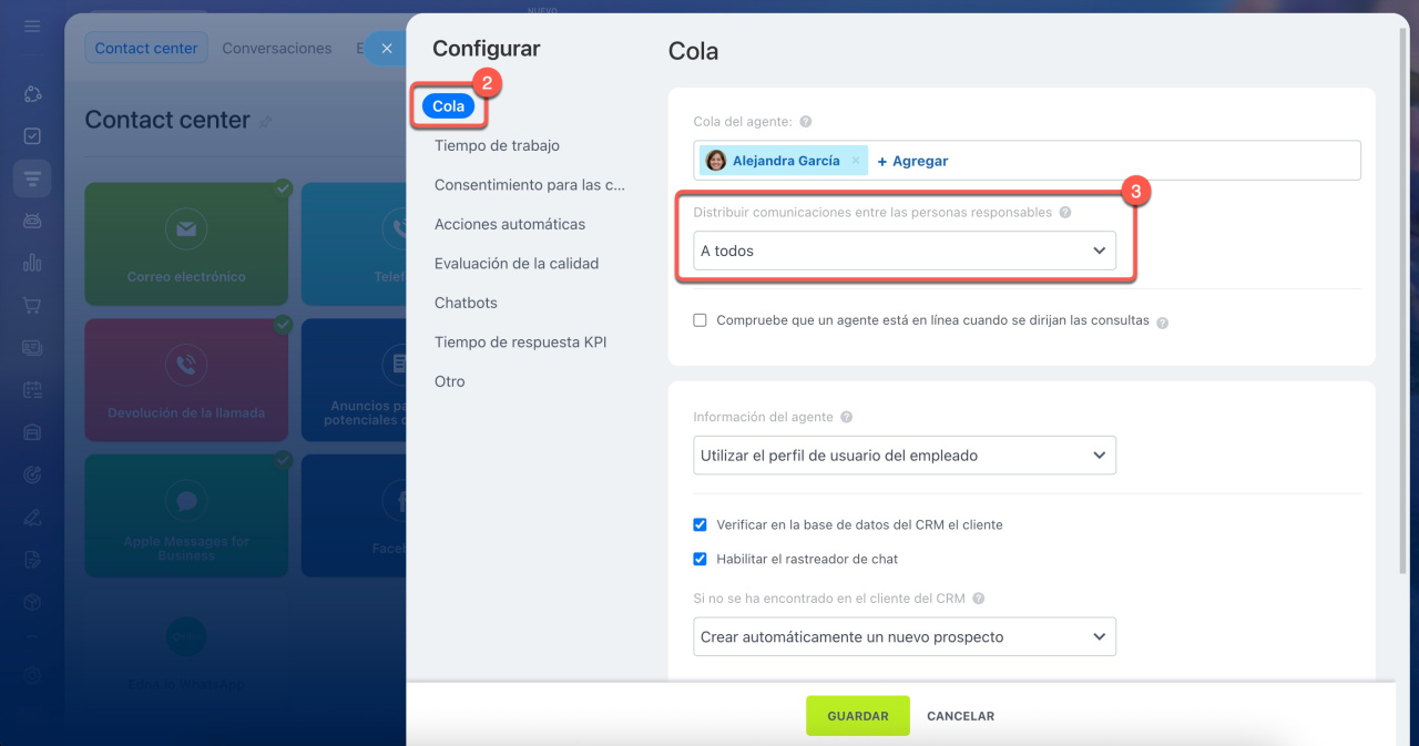 • A todos: todas las consultas llegan a todos los empleados de la cola al mismo tiempo. Cualquier operador puede hacerse cargo de la consulta.