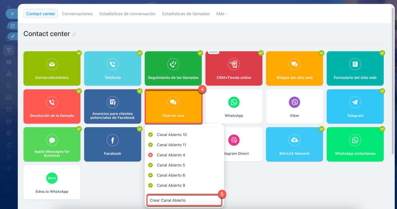 El número de canales abiertos depende de tu plan de Bitrix24: