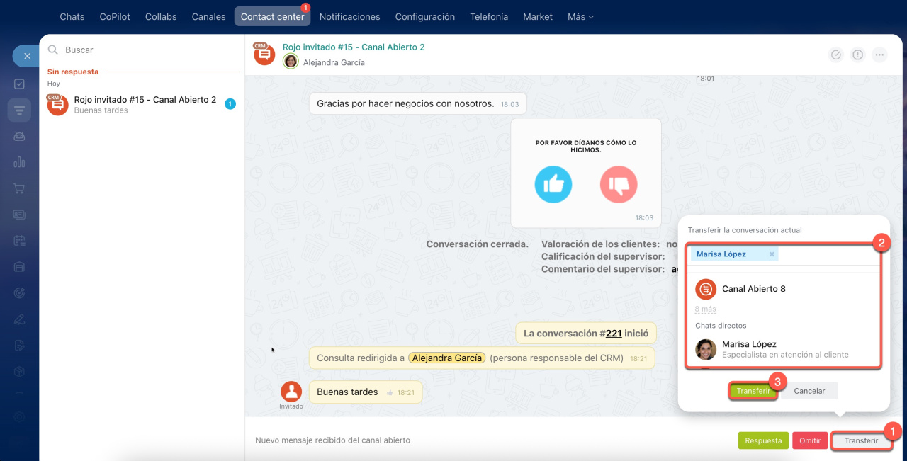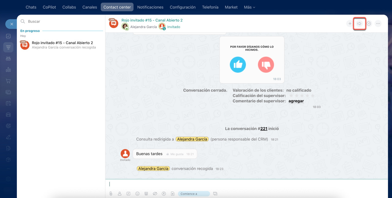Haz clic en el botón de flecha en la esquina superior derecha para transferir la conversación a otro empleado o canal abierto.