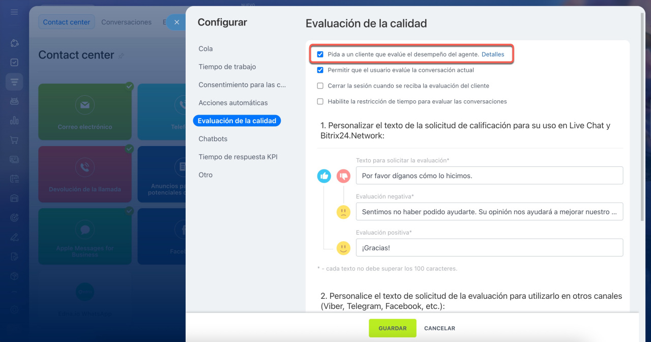 Para permitir que los clientes califiquen la calidad del servicio, ve a la pestaña Evaluación de la calidad en la configuración del canal abierto. Habilita la opción Pedir al cliente que evalúe el desempeño del agente.