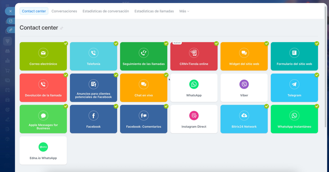 La sección de Contact center reúne múltiples formas de comunicación con tus clientes, incluyendo redes sociales, aplicaciones de mensajería, correo electrónico y llamadas telefónicas. Todas las consultas de los clientes llegan directamente a Bitrix24, donde pueden asignarse a los empleados. Esto asegura que no se pierda ninguna consulta y que los clientes reciban respuestas más rápidas. Este artículo responde a las preguntas más frecuentes sobre el Contact center.