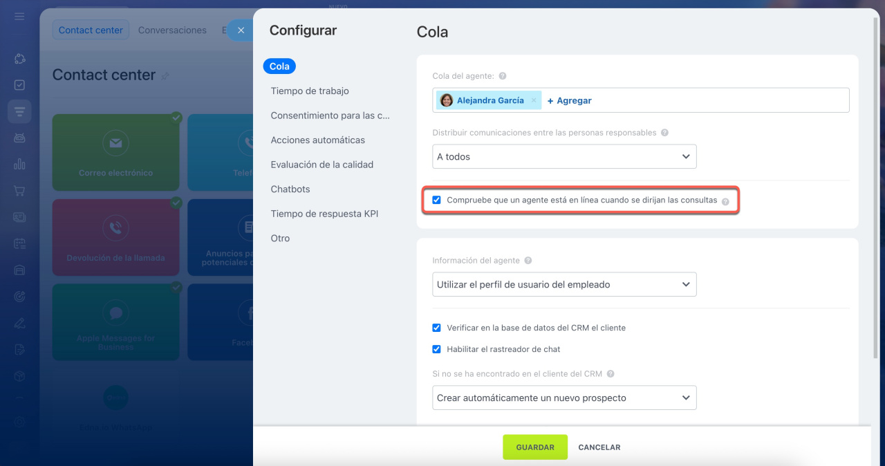 En la configuración del canal abierto, habilita la opción Comprobar que un agente está en línea cuando se dirijan las consultas. Esto asegura que las nuevas conversaciones no se asignen a empleados que estén desconectados o no disponibles (por ejemplo, durante el almuerzo o vacaciones).