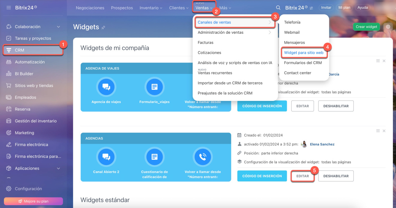 1-4. Ve a la sección de CRM > Ventas > Canales de ventas > Widget para sitio web.