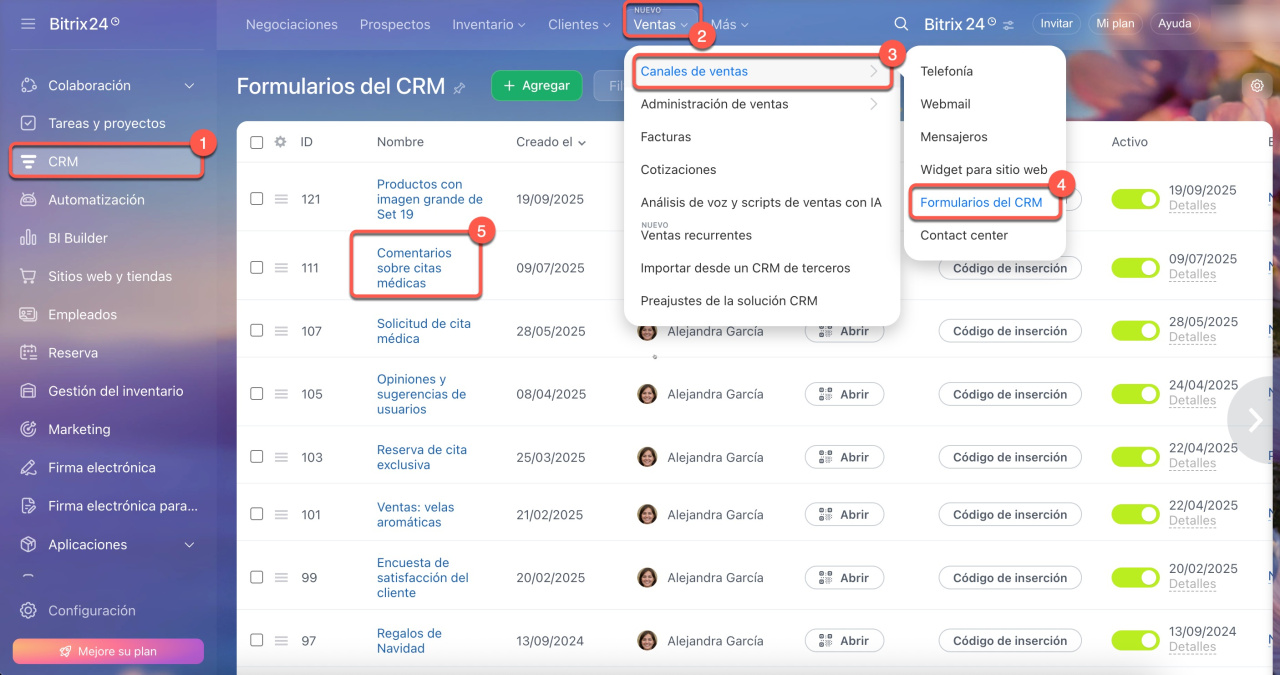 1-4. Ve a la sección de CRM > Ventas > Canales de ventas > Formularios del CRM.