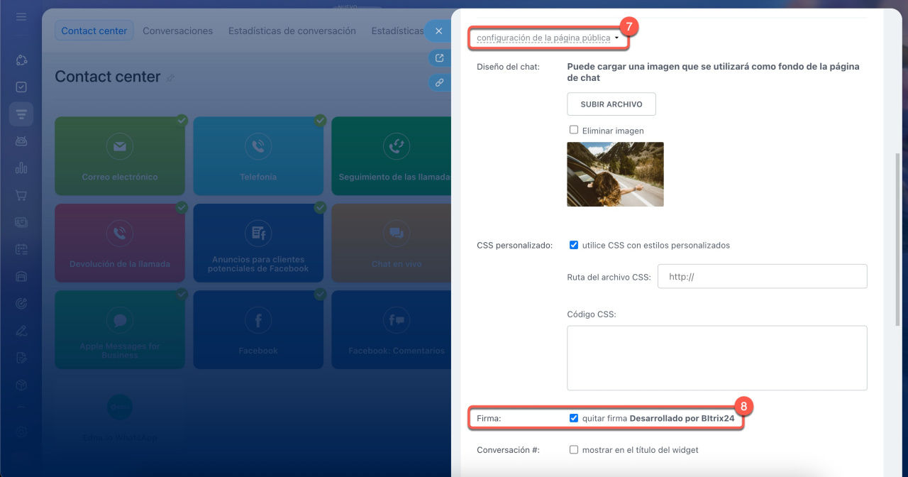 7-8. Ve a Configuración de la página pública y habilita la opción Quitar firma Desarrollado por Bitrix24.