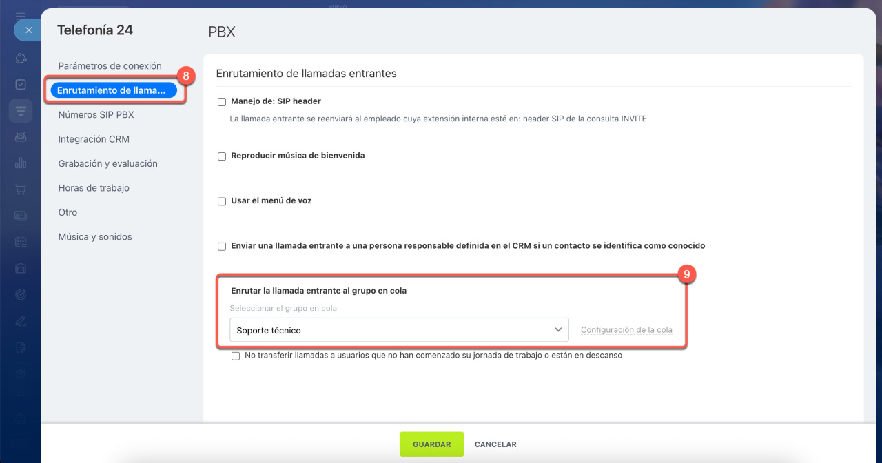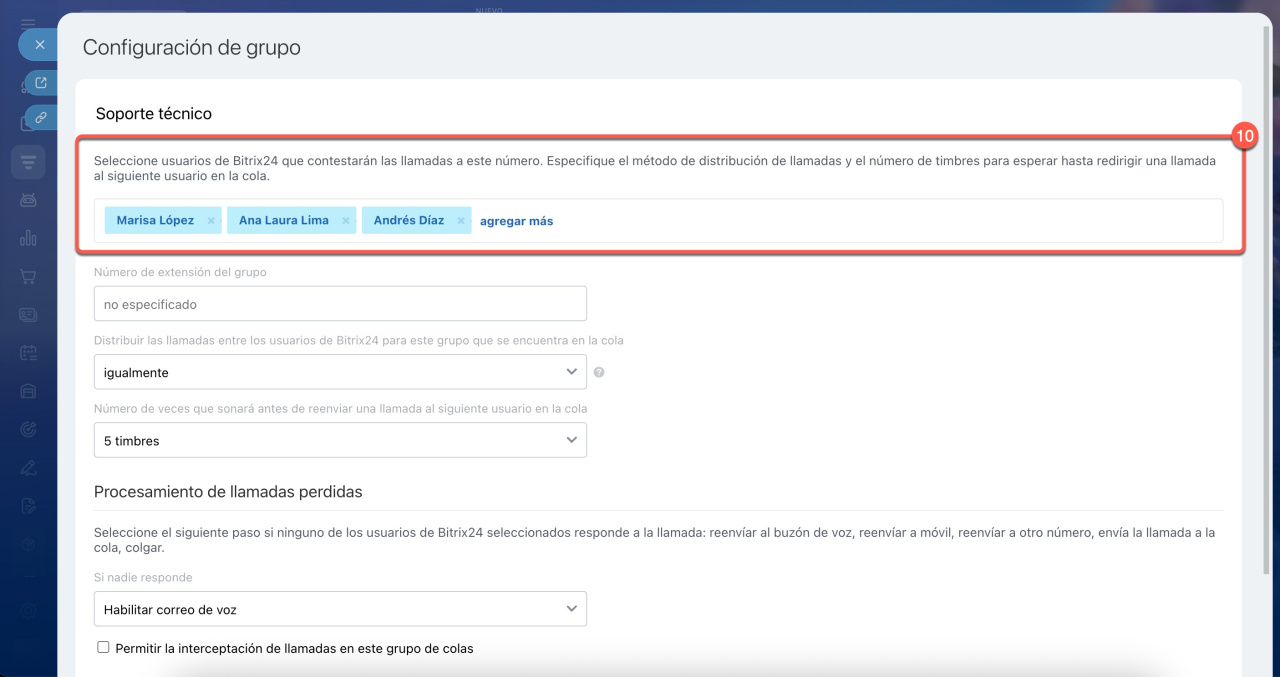 10. Ajusta el grupo de usuarios de telefonía para recibir llamadas entrantes. Puedes especificar uno o más empleados responsables y configurar el tipo de distribución.