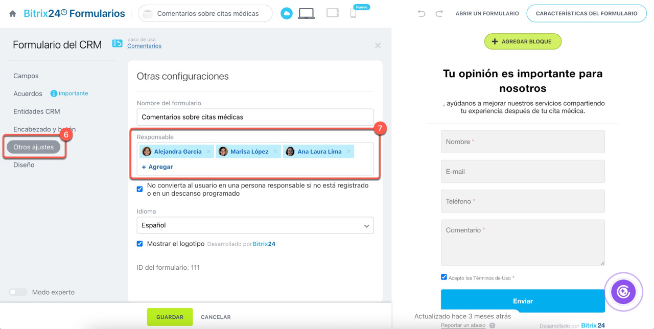 6-7. En la pestaña Otros ajustes, especifica uno o más empleados responsables de los datos enviados a través de este formulario.
